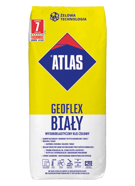 W recepturze kleju ATLAS GEOFLEX zastosowano innowacyjną technologię żelu krzemianowego. GEOFLEX to dostosowanie konsystencji kleju do indywidualnych preferencji wykonawcy i potrzeb wynikających z konkretnego zastosowania, poprzez dozowanie wody w zakresie znacznie szerszym niż w przypadku klejów tradycyjnych. Służy do przyklejenia każdego typu okładzin, zarówno nasiąkliwych jak i nienasiąkliwych. Pozwala bezpiecznie przykleić okładziny na balkonach i tarasach narażonych na bezpośrednie nasłonecznienie, ogrzewaniu podłogowym, lastryko, OSB i innych trudnych podłożach.