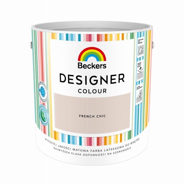 Beckers Designer FRENCH CHIC 2,5 L to wysokiej jakości farba lateksowa do wnętrz w eleganckim, stonowanym odcieniu inspirowanym francuską paletą barw. Produkt dobrze kryje podłoże i łatwo się rozprowadza wałkiem, pędzlem lub natryskiem. Tworzy matową, trwałą powłokę, którą można czyścić wodą z detergentem bez ryzyka szybkiego zużycia. Farba ma niską emisję lotnych związków organicznych, więc sprawdzi się także w pokojach dziecięcych i pomieszczeniach dla alergików.