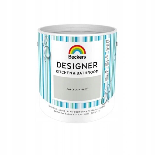 Beckers Designer Kitchen & Bathroom Porcelain Grey 2,5L to farba dekoracyjna stworzona specjalnie do pomieszczeń narażonych na wilgoć, takich jak kuchnie i łazienki. Produkt łączy elegancki, neutralny odcień szarości z wysoką odpornością na wodę i zabrudzenia. Dzięki temu pozwala uzyskać trwałe, estetyczne i łatwe w utrzymaniu czystości wykończenie wnętrz.