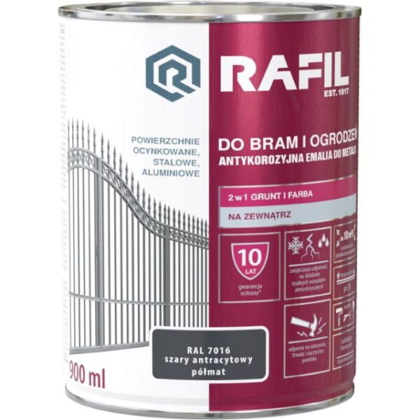 Antykorozyjna Emalia RAFIL DO BRAM I OGRODZEŃ przeznaczona jest do ochronno-dekoracyjnego malowania powierzchni metalowych: stalowych, ocynkowanych i aluminiowych eksploatowanych na zewnątrz pomieszczeń. Tworzy trwałą i elastyczną powłokę odporną na uderzenia. Charakteryzuje się zwiększoną odpornością na działanie trudnych warunków atmosferycznych. Zapewnia długotrwały efekt dekoracyjny malowanych powierzchni, a w zestawieniu z Rafil PODKŁAD ANTYKOROZYJNY stanowi silne zabezpieczenie przed korozją.