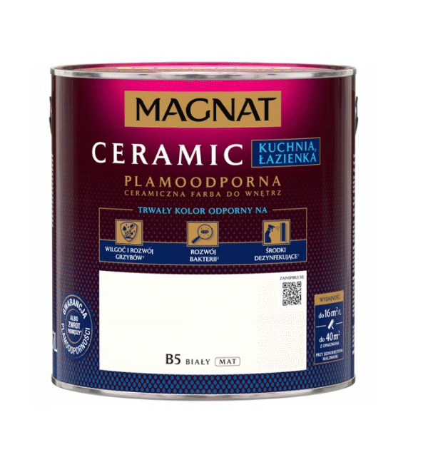 Farba Magnat Ceramic Kuchnia & Łazienka w kolorze czysta biel to produkt stworzony do malowania powierzchni wewnętrznych narażonych na wilgoć, zabrudzenia i częste mycie. Formuła ceramiczna z dodatkiem mikrokulek ceramicznych tworzy trwałą powłokę o wysokiej odporności na szorowanie i zmywanie, co ułatwia usuwanie plam, tłuszczu i wilgoci bez uszkadzania warstwy malarskiej. Powłoka dobrze kryje i szybko schnie, co pozwala uzyskać estetyczne, jednolite wykończenie w kuchniach, łazienkach i innych pomieszczeniach użytkowych.