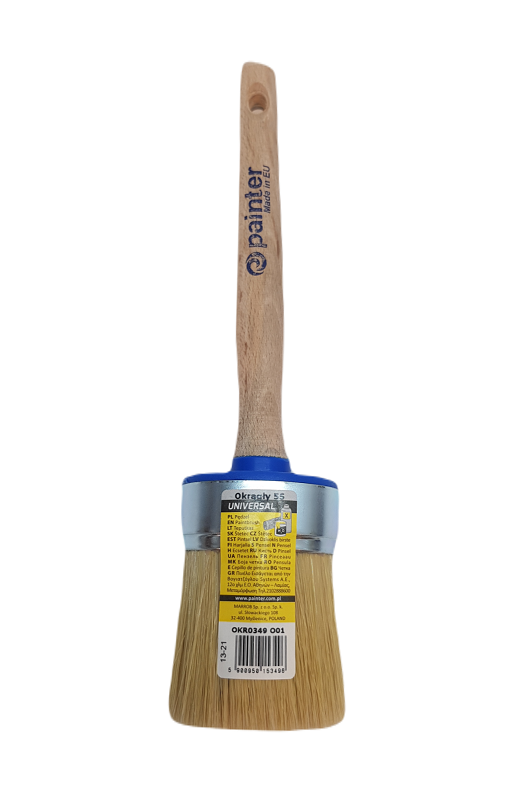 Pędzel okrągły o średnicy 55 mm (OKR0349) to praktyczne narzędzie malarskie przeznaczone do precyzyjnego nanoszenia farb, lakierów i impregnatów na różnych powierzchniach. Okrągły kształt włosia ułatwia dotarcie do narożników, frezów i detali, co sprawdza się zarówno przy pracach wykończeniowych, jak i renowacyjnych. Pędzel dobrze leży w dłoni i zapewnia kontrolowane prowadzenie farby, co poprawia efektywność i estetykę malowania.