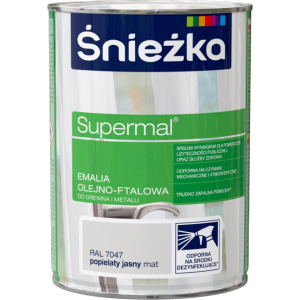 Emalia olejno‑ftalowa ŚNIEŻKA SUPERMAL w kolorze popielaty jasny mat przeznaczona jest do malowania powierzchni wewnętrznych i zewnętrznych. Produkt dobrze przywiera do drewna, metalu oraz wcześniej malowanych powierzchni. Tworzy trwałą, odporną na ścieranie i czynniki atmosferyczne powłokę. Farba jest łatwa w aplikacji pędzlem, wałkiem lub natryskiem, szybko schnie i zapewnia jednolite, estetyczne matowe wykończenie.