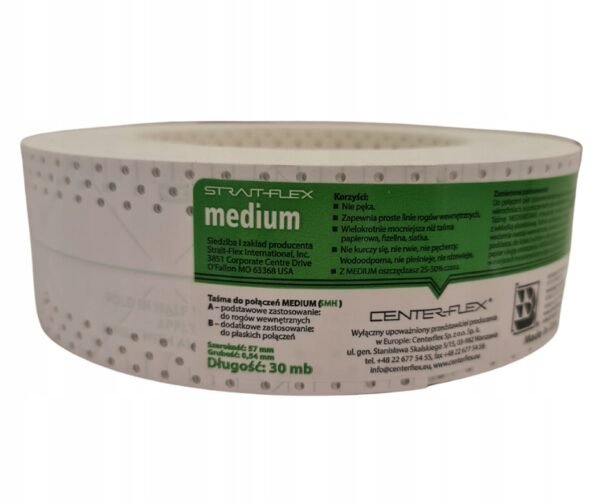 Taśma USA MEDIUM zielona 10 m to profesjonalna taśma wzmacniająca przeznaczona do łączeń płyt gipsowo-kartonowych w systemach suchej zabudowy. Produkt umożliwia wykonywanie trwałych, równych i odpornych na pęknięcia spoin na połączeniach płyt gk. Taśma sprawdza się szczególnie przy wzmacnianiu połączeń płaskich oraz narożników wewnętrznych, gdzie wymagana jest wysoka stabilność i precyzja wykonania. Specjalna konstrukcja zapewnia dobre dopasowanie do podłoża oraz łatwą współpracę z masami szpachlowymi. Taśma MEDIUM ogranicza ryzyko powstawania rys i pęknięć, zwiększając trwałość wykończenia powierzchni.
